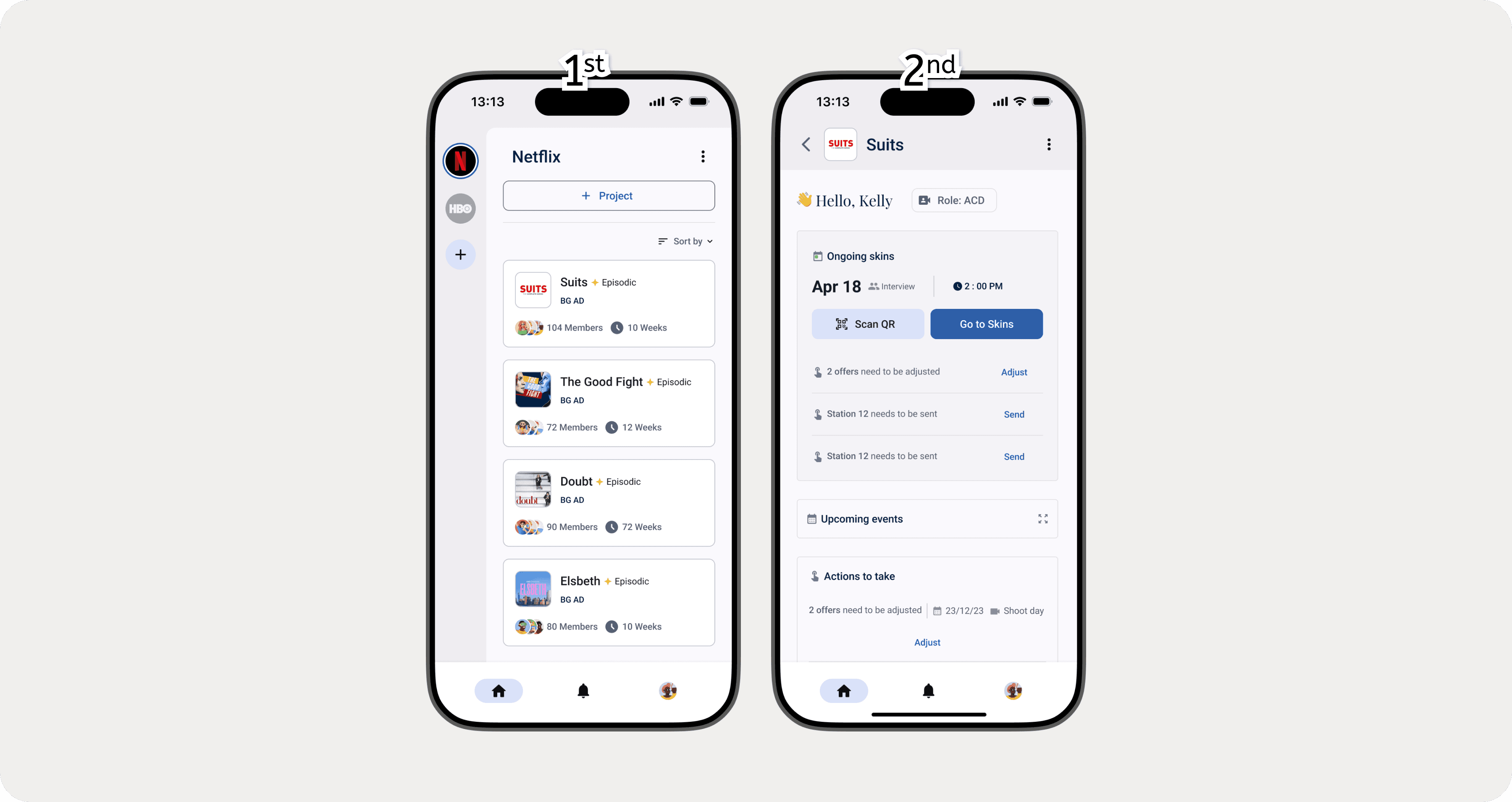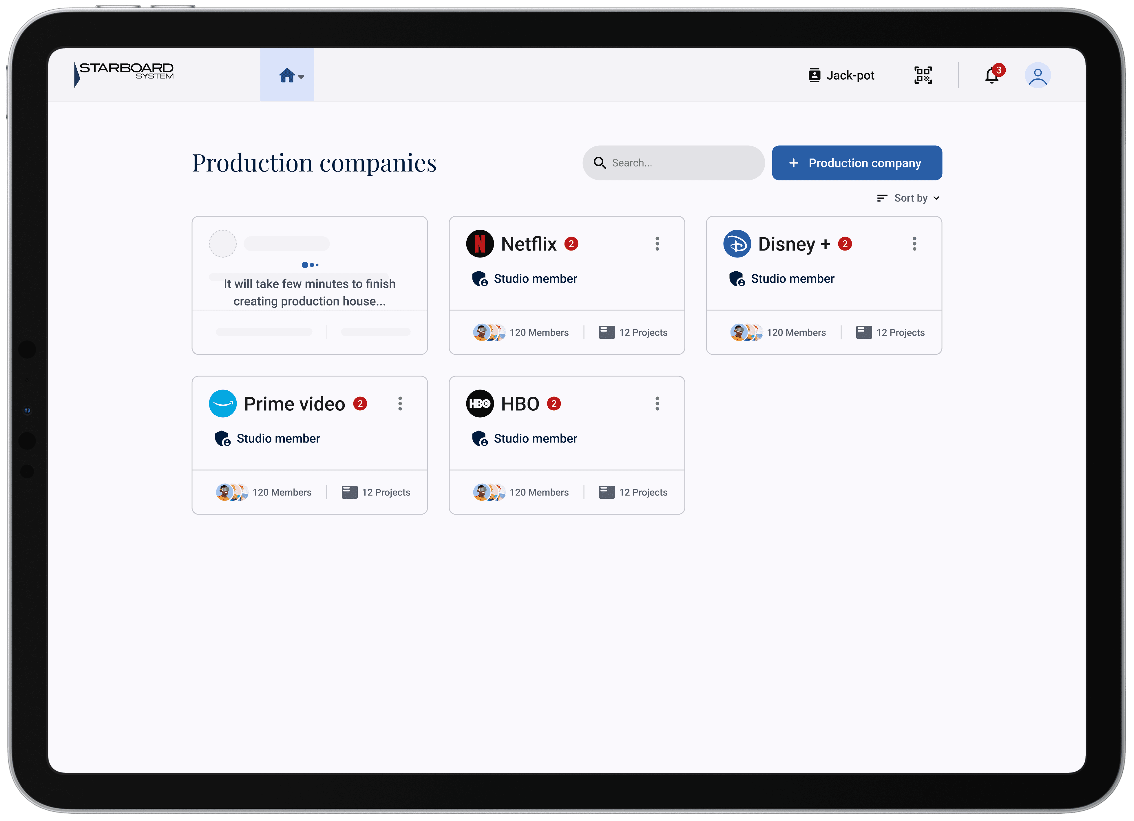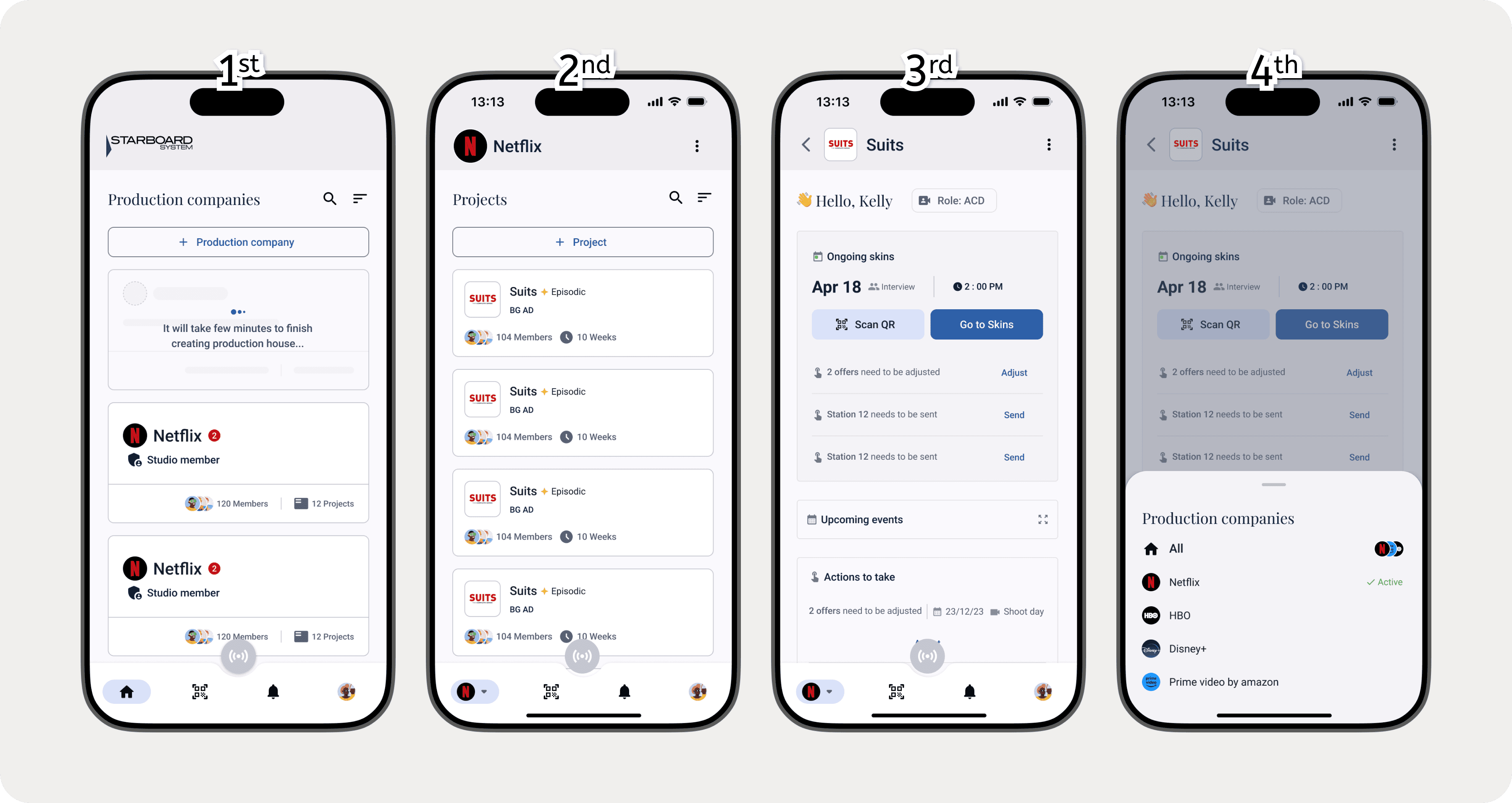My research led me to study patterns in applications that handle similar high-level context switching, and I found inspiration in Discord's server navigation. I adapted this pattern for Starboard, creating a vertical rail on the left side of the screen that displays each production company as a circular profile image. Tapping a production’s image instantly reveals a list of related projects on the main screen. This side-by-side view allows producers to see both the production context and its projects simultaneously, creating a faster, more flexible, and less error-prone navigation flow than a traditional multi-step menu would have allowed.