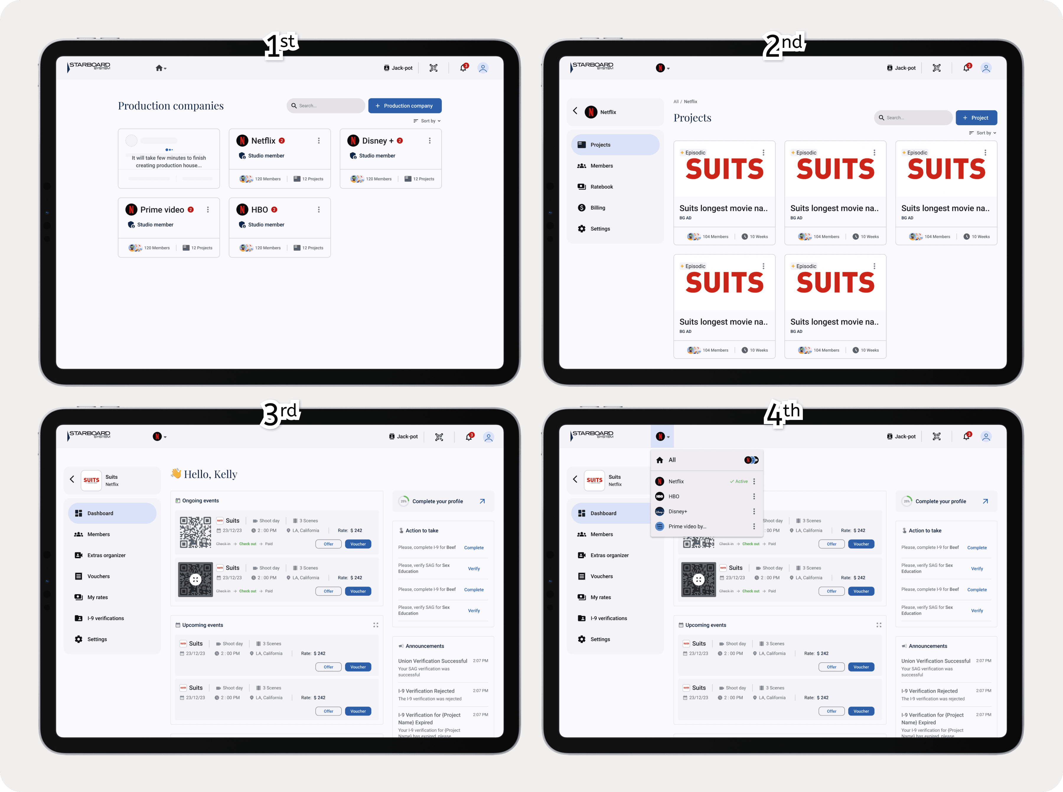 Mobile navigation often benefits from its own patterns rather than a literal desktop translation, so it felt important to explore other options. I explored two directions: a mobile-first alternative optimized specifically for rapid switching between production companies and projects, and a single, shared navigation model across desktop, tablet, and mobile for maximum consistency. The intent wasn’t to “disprove” the shared approach—it was to keep the experience snappy with minimal mental load and see what we could improve about context switching. Producers regularly bounce between production companies while managing multiple projects, so the navigation had to support rapid context switching without adding friction.